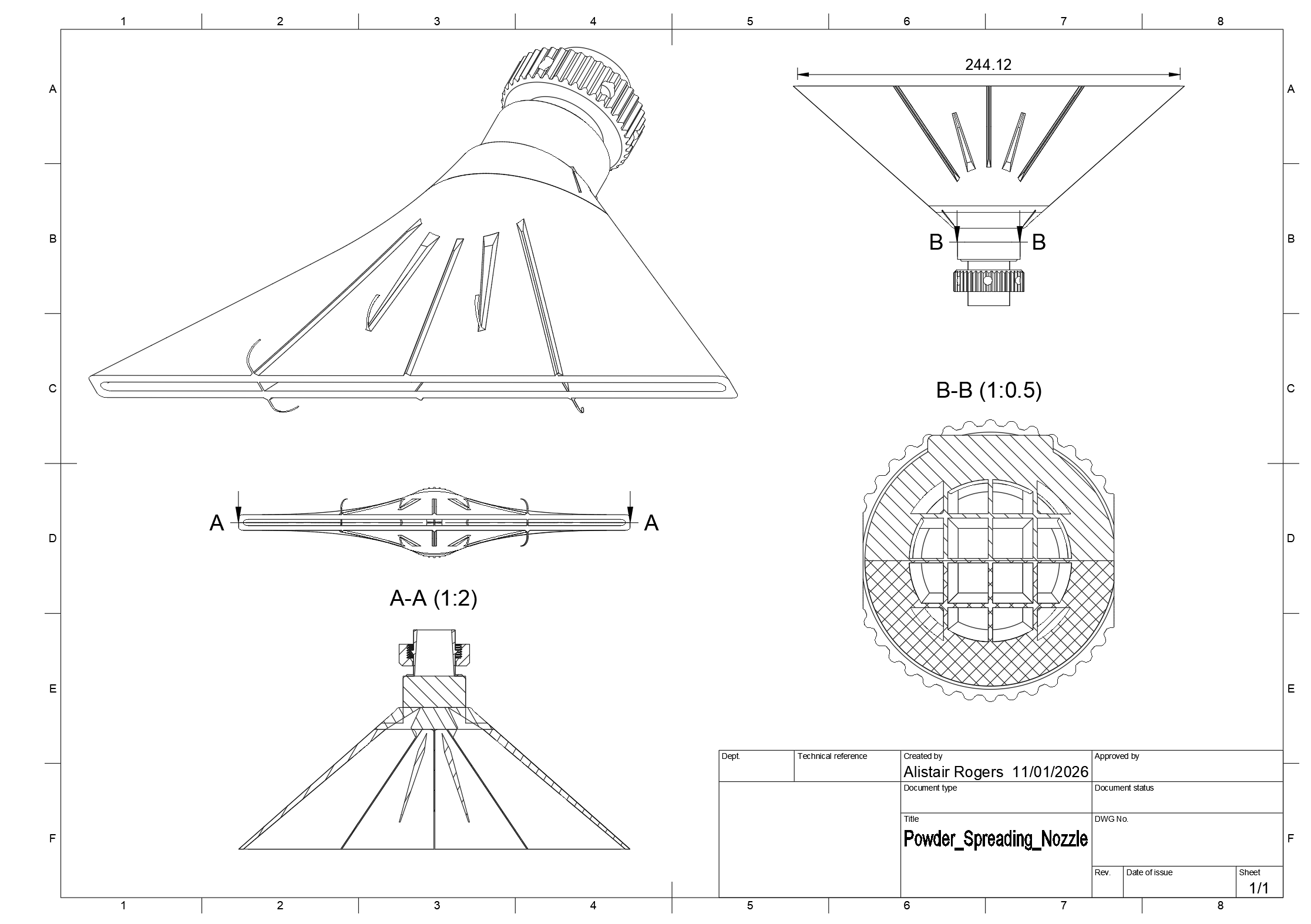 A technical drawing presenting the geometry of the powder eductor is presented below. When the eductor is combined with the spreading nozzle, the true powder discharge rate can be determined through experiment with a given powder.
